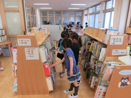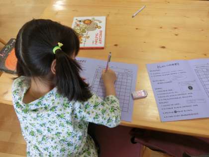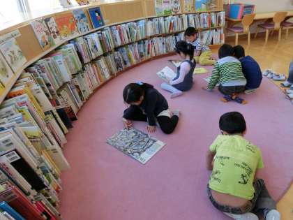 図書室をのぞいてみると、じっくりとお話の世界にひたっているお友達がたくさん! 興味深そうに書棚から読みたい本をチョイスし、おしゃべりをせずに本と向き合っています。カードへの記入もバッチリできていましたね。