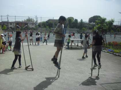 休み時間になると子供たちは元気に校庭へ向かいます。今日は竹馬にチャレンジしたり、ボールを使ってのゲームをしたり・・・お花の水やりの世話をする子供たちもいました。