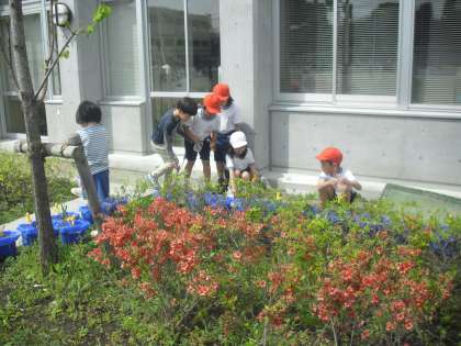 植木鉢の近くで何かを発見した様子で・・・見つけたテントウムシの幼虫を見せてくれました。さまざまな活動を通しての発見もたくさんですね。