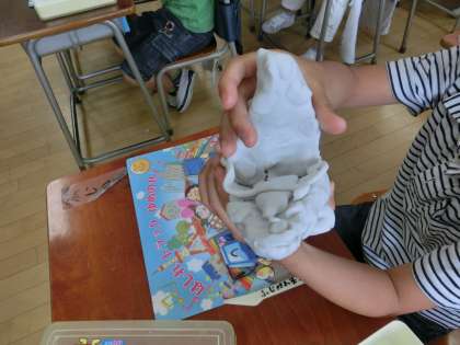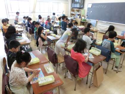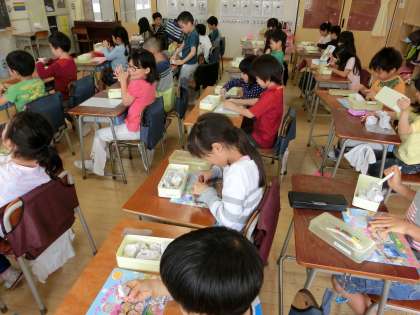 ねんどを使った造形活動に興じている2年生の子どもたち。学習規律を守りながら、作業を進めています。本時の授業単元名は「ひみつのグアナゴ」。豊かに発想をふくらませながら、創意工夫あふれる作品を仕上げることが目標です。また、低学年の学習は図工に限らず、楽しさを味わいながら、活動に対する意欲を高めていくことが、とても大切です。一人ひとりの嬉しそうな顔つきは、学習への前向きな姿勢を感じるに十分ないきいき指数でしたね。