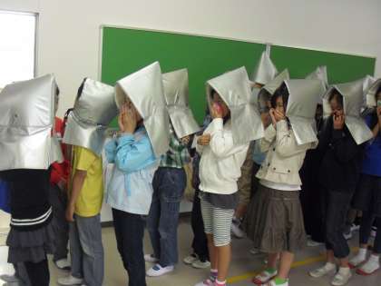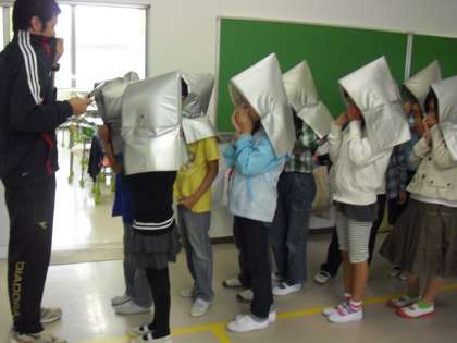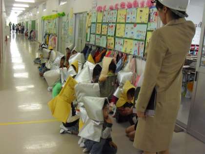 今日は、雨のため避難訓練の方法を変更して行いました。まずしっかりと防災頭巾をかぶり、口にハンカチやタオルを当てて廊下に並ぶ練習です。1年生は初めて実際に行う避難訓練でしたが、とても上手に並べていました。