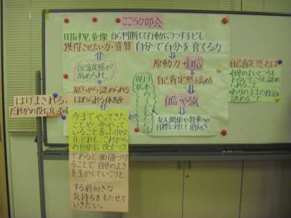 芦花小学校では「自ら判断して行動にうつす子ども」の育成をめざし、こころ力部会で自分で自便を育てる力(自己教育力)を獲得させるため、自己肯定感を高める働きかけの指導に取り組んでいます。6年生の道徳の時間に、「個性の伸長」を題材とした授業に取り組み、全教員で授業についての協議をしました。自分の「よさ」に気付き、自分自身で前向きに自己実現に向かって努力していこうとする子供を育てていくために、教員も授業改善に取り組んでいます。