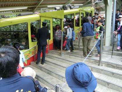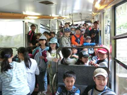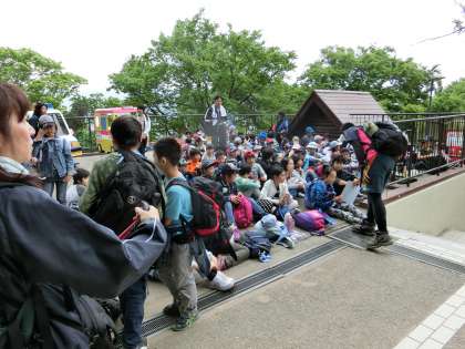ついに高尾山に登頂! クラスの集合写真を撮影したら、都会のような賑わいの中を下山です。日本一の急勾配を下るケーブルカーは、芦花小の貸し切り運行となり、車内では絶叫がこだましていましたね。あんなに苦労して登った高尾山なのに、下山はあっという間の出来事でした。