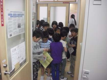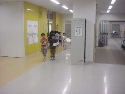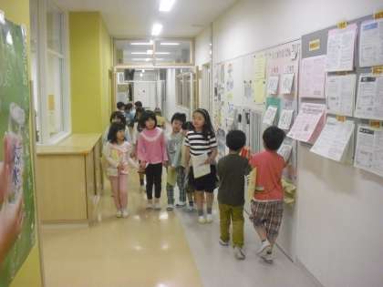 2年生が1年生を案内しながら、学校の中を探検しています。ここは、事務室、保健室・・・などやさしく教えていました。「ここは校長室・・校長先生がお仕事をしていたら静かにね」などなど・・、かわいらしい2年生の解説もほほえましいです。