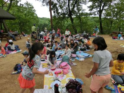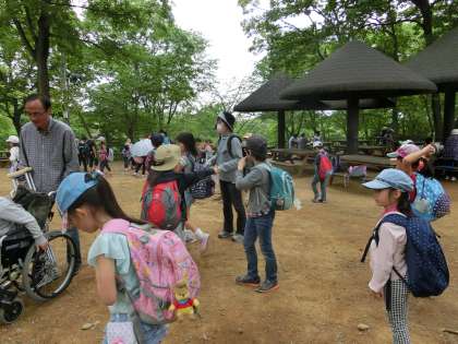 食後は「飛ぶ鳥、あとを濁さず」です。全員で広場のゴミ拾いをしてから広場を後にした、気持ちのよい芦花小メンバーです。