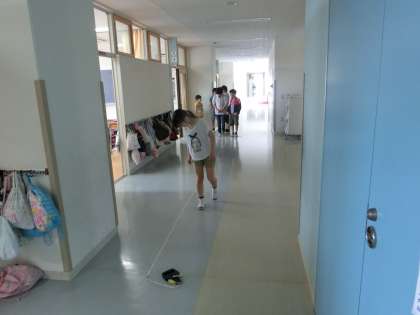 廊下に置かれたメジャーの横を一歩一歩、慎重に歩く5年生。算数で長さの学習? いえいえ、違いました。一人一人が10歩分の長さを測り、歩幅の平均を求める活動に取り組んでいると、少年がいきいきとした表情で教えてくれましたよ。