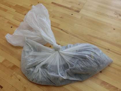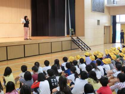 朝会でお話している生活指導の山崎先生が手にしている袋には、どっさりと砂が入っています。主事さんがピロティを掃除すると、毎日こんなに砂が集まってしまうのだそうです。校庭で活動したあと、靴の裏についている砂をきちんと落としてくる約束を一人一人が意識できたら、きっと減るに違いありません。運動会シーズンに突入し、校庭での活動がさらに多くなりますが、ピロティの砂は逆に減っていきますように!