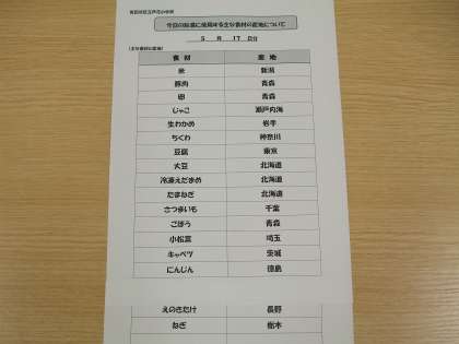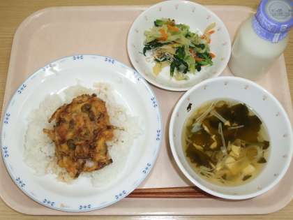 今日の給食は、“つゆだく”がおいしい「かき揚げ丼」でした。かき揚げは給食室で1つずつ揚げ上げています。芦花小学校と芦花中学校の分を合わせて、約1200個のかき揚げを作りました。