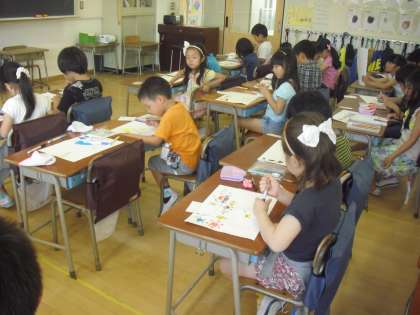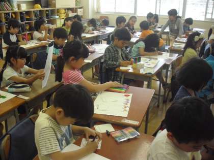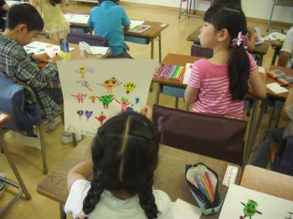 1年生の教室で自分のマークを決める活動をしていました。いくつかのアイディアの中から一つ選びました。どれにしようかな・・・と、どれも一生懸命考えたマークなので悩んでいましたね。