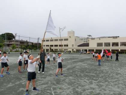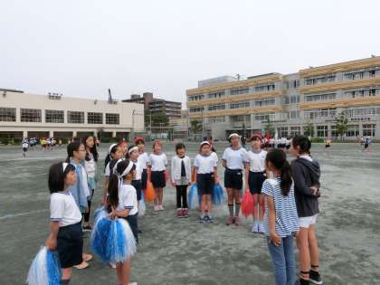 始業前から校庭では、リレー、応援、チアの練習が行われています。
