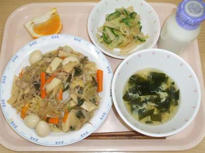 毎日、朝から楽しみにしている給食♪今日は具材がたくさん入った「シャンハイ麺」でした。配膳がちょっと難しい麺料理・・・。いつもの1年生は6年生のお手伝いに頼りっきりですが、今日は自分たちだけで見事に配膳をこなしました。