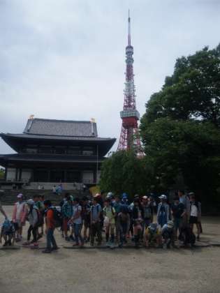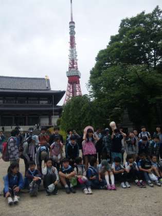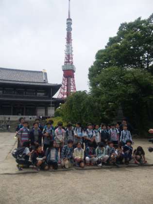 徳川家の菩提寺、東京タワーを背景に記念撮影をしました。これから東京タワー見学です。