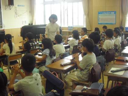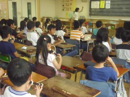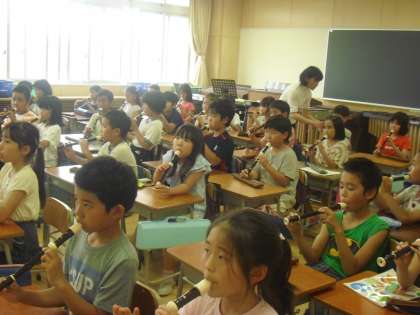 3年生で始まる縦笛の練習です。指でしっかりと穴をおさえ、美しい音を出します。ツーツーツーとタンギングでリズムを刻みました。みんな新しいリコーダーの学習も楽しんで活動していましたね・・・。