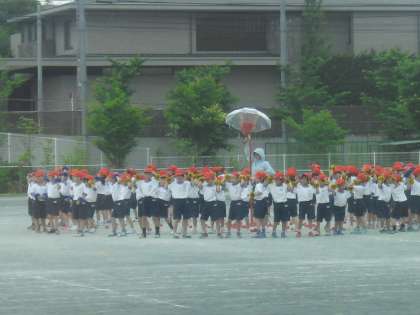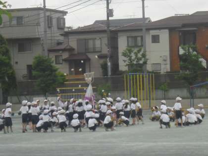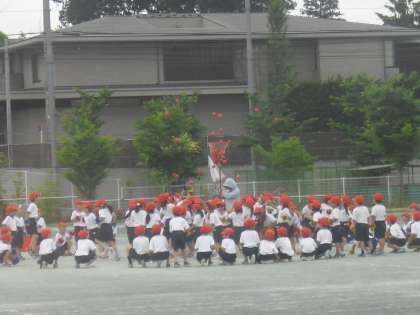 赤も、白もかごをめがけて玉を投げ・・・途中にかわいいダンスをはさんでの玉入れの練習が始まりました。今日はどちらがたくさん入れることができたでしょうか・・・・