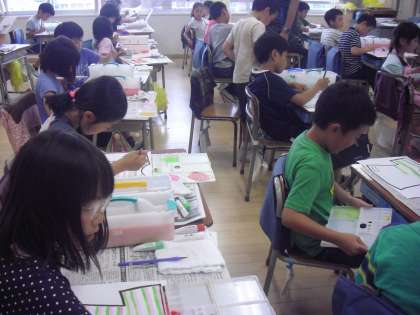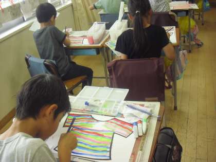 絵の具の筆の使い方の学習で、2年生がしましまTシャツを描いていました。作った色を上手に筆で伸ばして、練習をしながらしましまTシャツが仕上がっていきました。