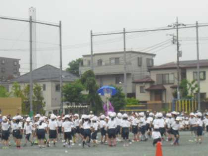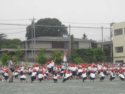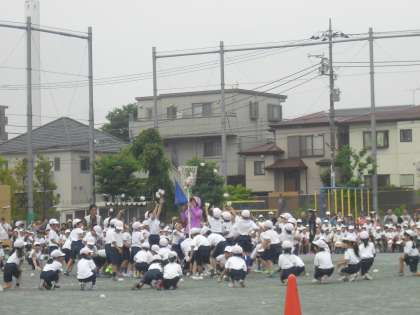 かわいいダンスを挟んでの1年生の玉入れです。赤も白も頑張ります。笛の合図で傘を使ってかごの上にはふたが・・・