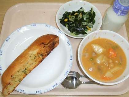 今日の「ガーリックトースト」はコッペ形のパンを使い、ちょっとお洒落に作りました。給食では、ニンニクの他に粉チーズを混ぜていて、ほんのりチーズの香りもしています。