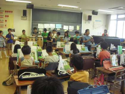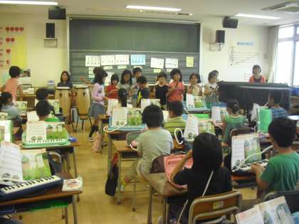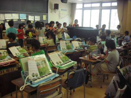 音楽室から楽しそうな演奏が聞こえてきました。楽器を交えての鍵盤ハーモニカでの演奏です。協力し合ってリズムを刻んだり、体で音楽を感じとりながら演奏することを楽しんでいる様子がよく伝わってきましたよ・・・・。