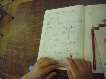 テープの長さを求める活動を通して倍の考えを知る学習です。「何算で考えますか・・」の問いにわり算、ひき算、かけ算、たし算・・・友達の発表を聞いて「質問〜」と元気よく手があがっていました。みんなの考えを聞きながら、どんなことを発見することができたでしょうか・・・