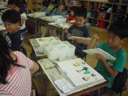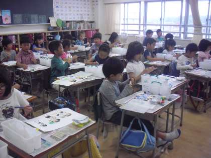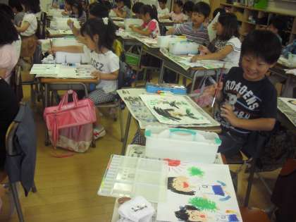 2年生の教室で運動会の思い出の場面を絵に表す活動をしていました。太筆を使って背景を塗ります。かけっこ、ダンス・・・それぞれの思い出のシーンがよみがえってきましたね。