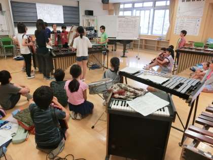 そして今日のメインは、『リボンのおどり』の合奏発表会へ向けての最終練習です。グループに分かれ、それぞれ音の重ね方を工夫しながら演奏しています。小川先生のアドバイスに耳を傾けながら、自分たちの音を仕上げていく様子がダイレクトに伝わってきた活動風景でした。他のグループ演奏を互いに聴き合う場面もありました。
