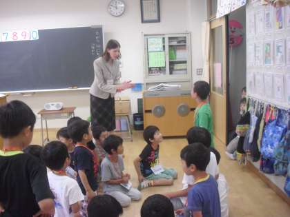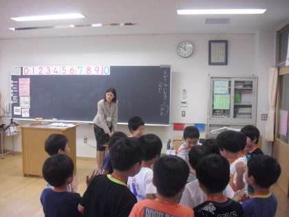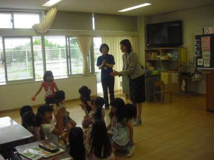 音楽に合わせてボールを回し、自分のところでボールが止まったら、英語で自己紹介・・・・「マイネームイズ○○・・・」しっかり言えましたね。