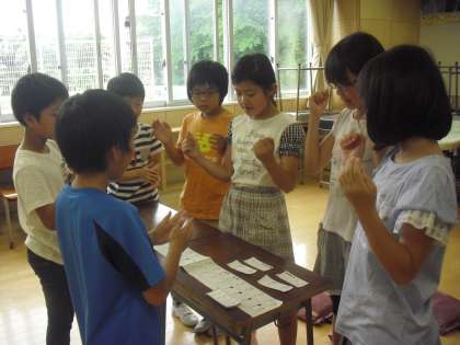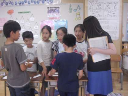 音楽の旋律に合わせて、リズムをみんなで考えます。いくつかのリズムのパターンから選び並べて・・・・みんなで試して・・・リズムができ上がっていきましたね!