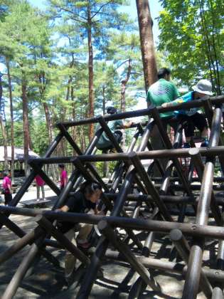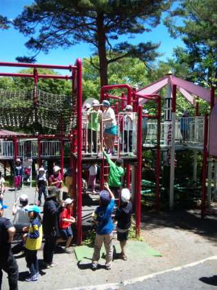 アスレチック遊具で楽しく体を動かしています。他の学校の友達とも仲良くなりましたね。