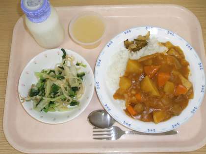 今日の「ポークカレーライス」は、香辛料がピリピリッと効いてくる辛口カレーでした。給食ではカレー粉以外にも、にんにく、しょうが、ガラムマサラを使っています。暑い時季は、香辛料を活用して、食欲を刺激しましょう。