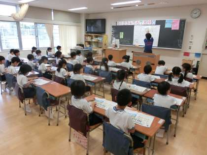 1年生はけんばんハーモニカの指遣いをレッスンしています。先生のお手本をよ〜く見ながら、しっかり真似をしています。低学年は特に、模倣を通して基本を身に付けていく学習が多いのです。