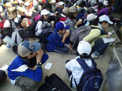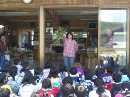 りんご園に到着し、楽しみにしていた果汁100%のジュースをいただきました。りんご園の関さんにりんごづくりについてのお話を伺いました。りんごの実がつくのは初めは10000個あるそうです。それが最後には150個から200個ぐらいになるそうです。一番難しく気を遣うのは枝の剪定作業だそうです。