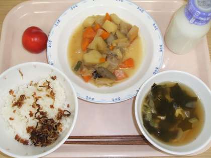 本日は“郷土料理給食”、6月は熊本県天草地方の「せんだご汁」でした。さつまいもを使って作ったお団子を入れた汁物です。団子のモチモチッとした食感がおいしい料理です。かつお節でとった“だし”もよくきいていましたね。