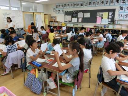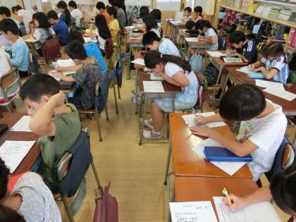 4年生が創作した詩を互いに読み合い、友達の作品のよさを発見しています。それを伝え合うことが、今日の授業のめあてです。相手のよさを見出していこうとする姿勢が身に付きつつあるおかげで、活動がとてもスムーズに進んでいます。ワークシートへどんどん記述していき、余白がなくなってしまう勢いです。