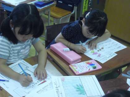 2年生の教室で、先日のまち探検で発見したことを学習カードにまとめる活動をしていました。自分たちの集めた情報から、見学したい場所を決め、探検コースを作成し、見学してきたことをまとめていました。おいしい和菓子のお店の情報をまとめている子どももいましたよ〜。