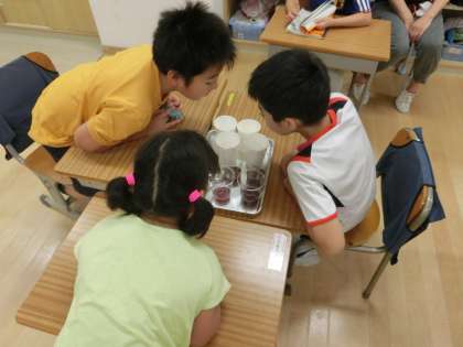 赤シソ液に塩、砂糖、レモン汁などを加え、色の変化を調べる実験を行いました。全く変化がなかったり、思いがけない色になったりして、あちらこちらから驚きや歓声が聞こえてきます。目で見た結果をワークシートに記入することも、しっかりとできていました。