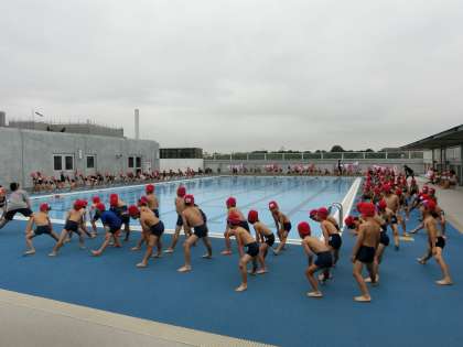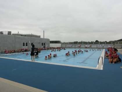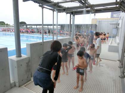 以前、教室で行った練習を生かしてサッと水着に着替え、心弾ませプールサイドへ繰り出した子どもたち。準備体操、シャワーと済ませ、いよいよ水の中へ。それだけでもう、大変な盛り上がりでした。