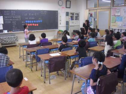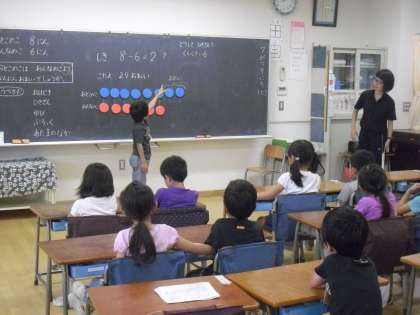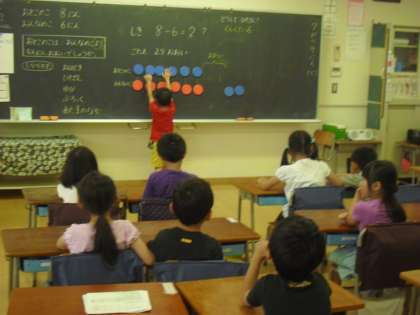 男の子と女の子の人数がわかっている問題から、どちらが何人多いのかを考える問題場面です。ひき算の問題だということになり、なぜひき算と言えるのかという議論に移っていきました。子どもたちが自分の考えを出し合い、自分の言葉で説明する中で、「なるほど」「すごい」「わあ」「ああそうか〜」などの言葉や拍手が広がっていきました。