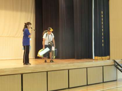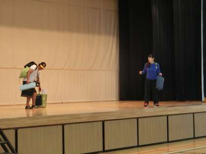 今週と来週の生活目標は「もちものを計画的に持ち帰ろう」、週番の先生方からこれに絡めた劇の披露がありました。こつこつと学用品を持ち帰っている山田さん、計画性なく過ごして最終日に大慌ての貝賀くん、二人の対比を通して、子どもたちに目標のもつ意味を実感させました。普段、先生方の姿はあまり登場しないHPですが、今日は特別に3ショット載せちゃいますっ!!