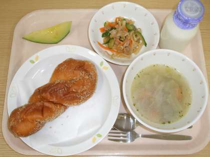 みんなが大好きな「揚げパン」♪今日の味付けは“白ごま”味でした。揚げ立てのパンに、白すりごま、グラニュー糖、塩を少々加えた粉をまぶして仕上げます。食缶にこぼれ落ちた粉まで、きれいにすくって食べ切っていました。