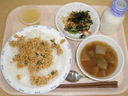 「ふわふわそぼろ丼」は、みじん切りの“凍り豆腐”を炒めて作った“そぼろ”をかけた丼物です。お肉だけのそぼろよりも、ふわふわした食感をしています。よく絞った凍り豆腐は、味も染み込みやすくなっています。