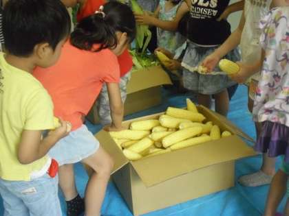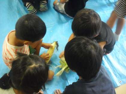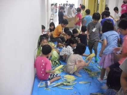 農家の方が心をこめて育てた野菜・・・その思いを感じながら、1年生がトウモロコシの皮むきをしてくれました。皮むきをしながらいろいろな発見もしていました。今日の給食に登場しますよ〜お楽しみに!!
