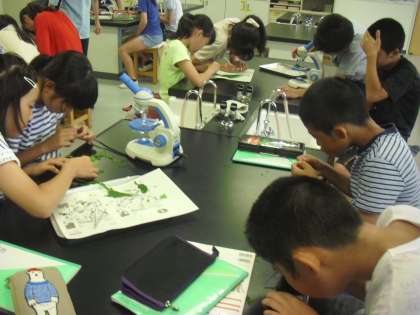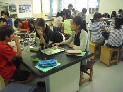 理科室では、顕微鏡を使って葉の葉脈を観察していました。葉の葉脈が観察できるように薄くはがし、プレパラートにのせ光の加減をして・・・・うまく見えましたか・・・