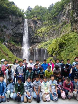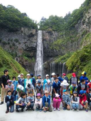 華厳の滝を見学、天気もよく気持ちのよい流れの前で集合写真を撮りました。
