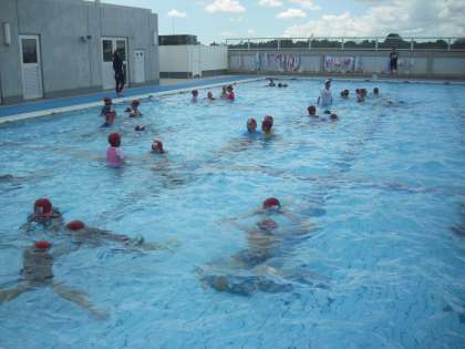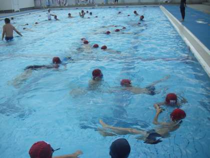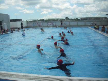2年生は水慣れからスタートです。水面にみんなで作った人の花が咲きました。水中かけっこも頑張っています。