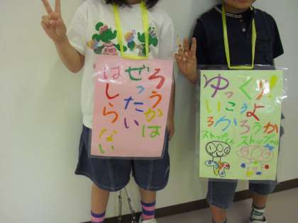これは2年生がクラスの中で考えた方法です。このカードを首から下げて注意をするのです。「今日は誰も注意する人がいなかった!!」うれしい報告をしてくれた2年生の2人です。顔をお見せできないのが残念です。