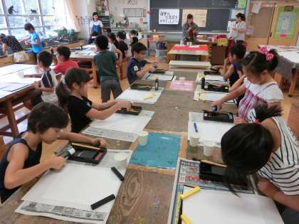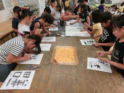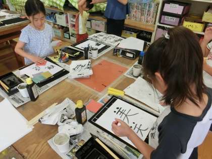サマーワークショップ、本日は中学年が対象の「書道で図工」教室でした。お手本なしに、一人ひとりが色紙に毛筆で自分の名前を書き上げていきます。仕上がった字体は、まさに十人十色。普段の書写授業とは、ひと味もふた味も違う活動です。その色紙に、さらに各自が自由な発想で色付けをしていくと、一段と個性豊かな作品に進化していくのでした。国語と図工の学習がコラボしたような、ユニークな体験となりましたね。