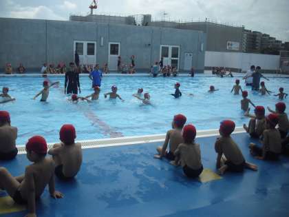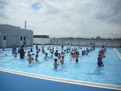 1年生の水泳指導です。低学年では水中を動きまわったり、もぐったり、浮いたりする水になれ親しむことを通して、伸び伸びと体を動かす楽しさや心地よさを味わい、体力の向上を図ります。今日も思いっきり手で水をかき、前に進んでいましたね。