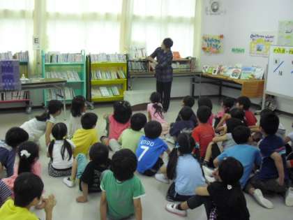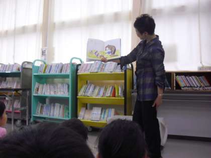 2時間目、図書室で1年3組の「お話会」がありました。この活動は、本校の特色ある教育活動として年間を通して全学級で行います。全日本語りネットワークから講師の先生をお招きし、読書への興味・関心、感性を育てることをねらいとして取り組んでいます。表現豊かに、何冊もの絵本を読んでくださり、1年生はお話に引き込まれていました。