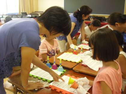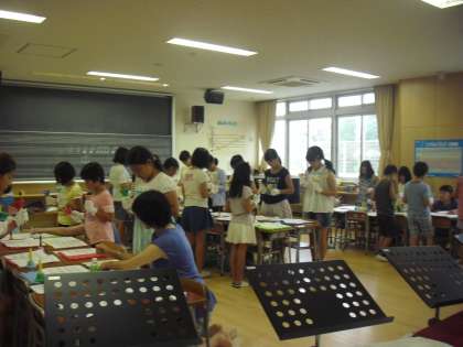 音楽室ではミュージックベルに挑戦するサマーワークショップが開かれました。ベルの形をした打楽器は1本ずつ違う音が出るので、皆で分担し演奏します。心も一つに皆で音色を合わせ、曲を演奏する楽しさを味わうことができましたね。