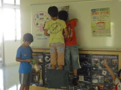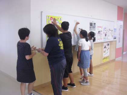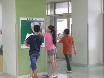 2学期がスタートしての委員会活動。整美委員会のメンバーは校内の掲示物を貼り変える作業です。みんなへのお知らせも書き込んでいました。みんなも目を通してくださいね。